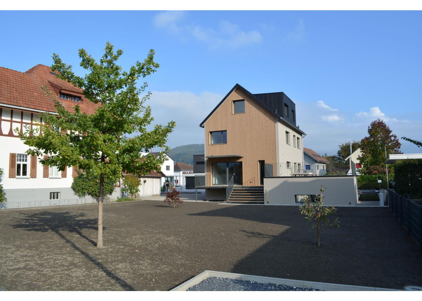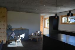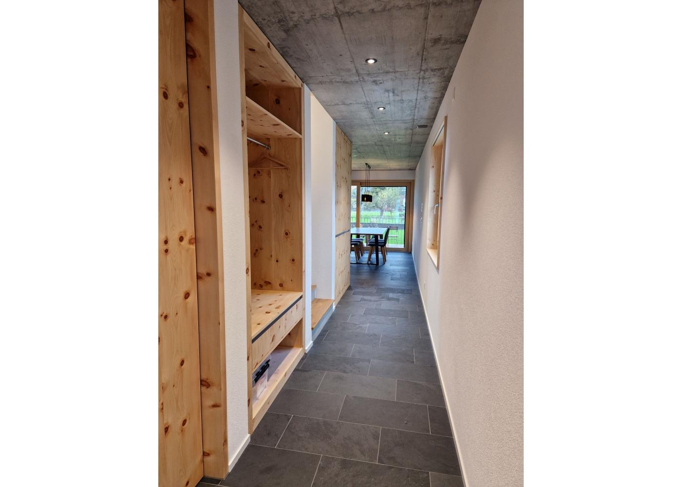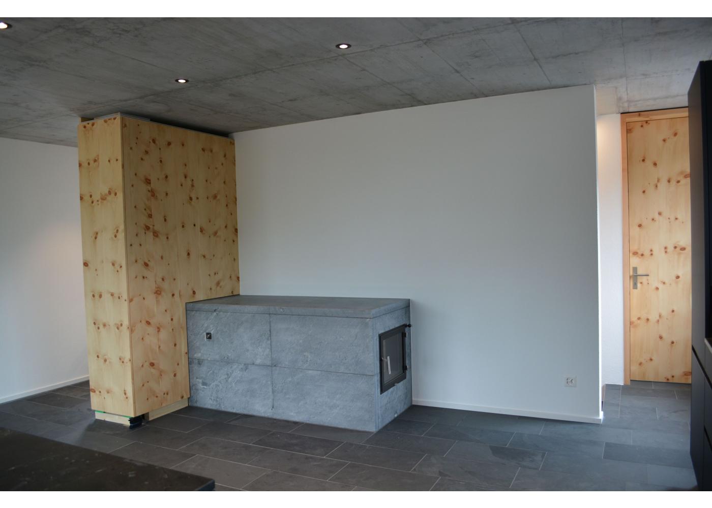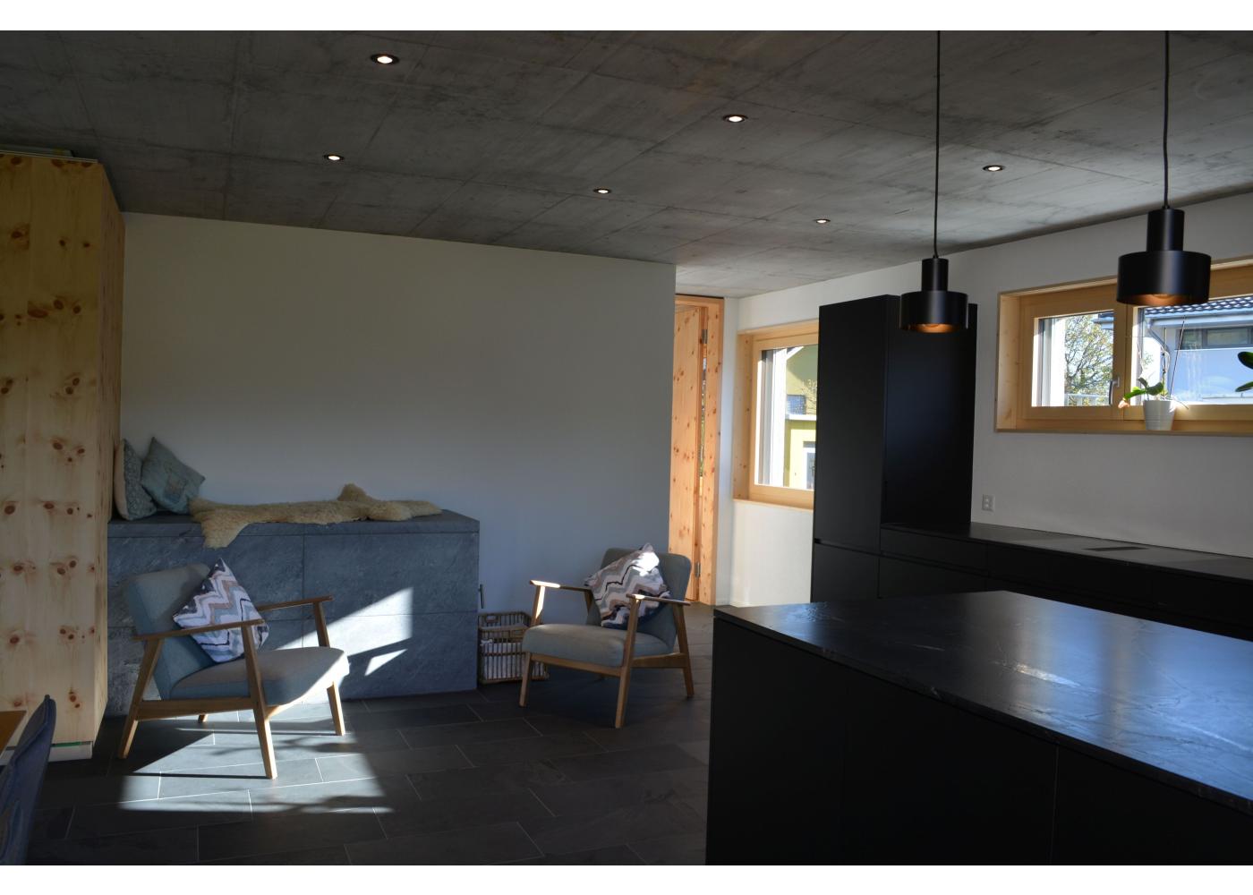 Formal und volumetrisch wurde dieses Einfamilienhaus auf das denkmalgeschützte Gebäude ausgerichtet. Gegen Westen, mit dem grossen Rasen und Spielbereich, wurde mit einer Holzfassade und Holzterrasse der Charme unterstrichen. Gedämmt mit Mineralwolle und einem Dickschichtputz und 4mm Körnung, sowie einem Doppelfalzdach ist eine hohe Langlebigkeit garantiert. Sichtbetondecken im Kontrast zu Arvenmöbel und raumhohen Arven-Blockrahmentüren strahlen ein grossartiges Ambiente aus.