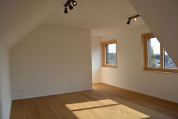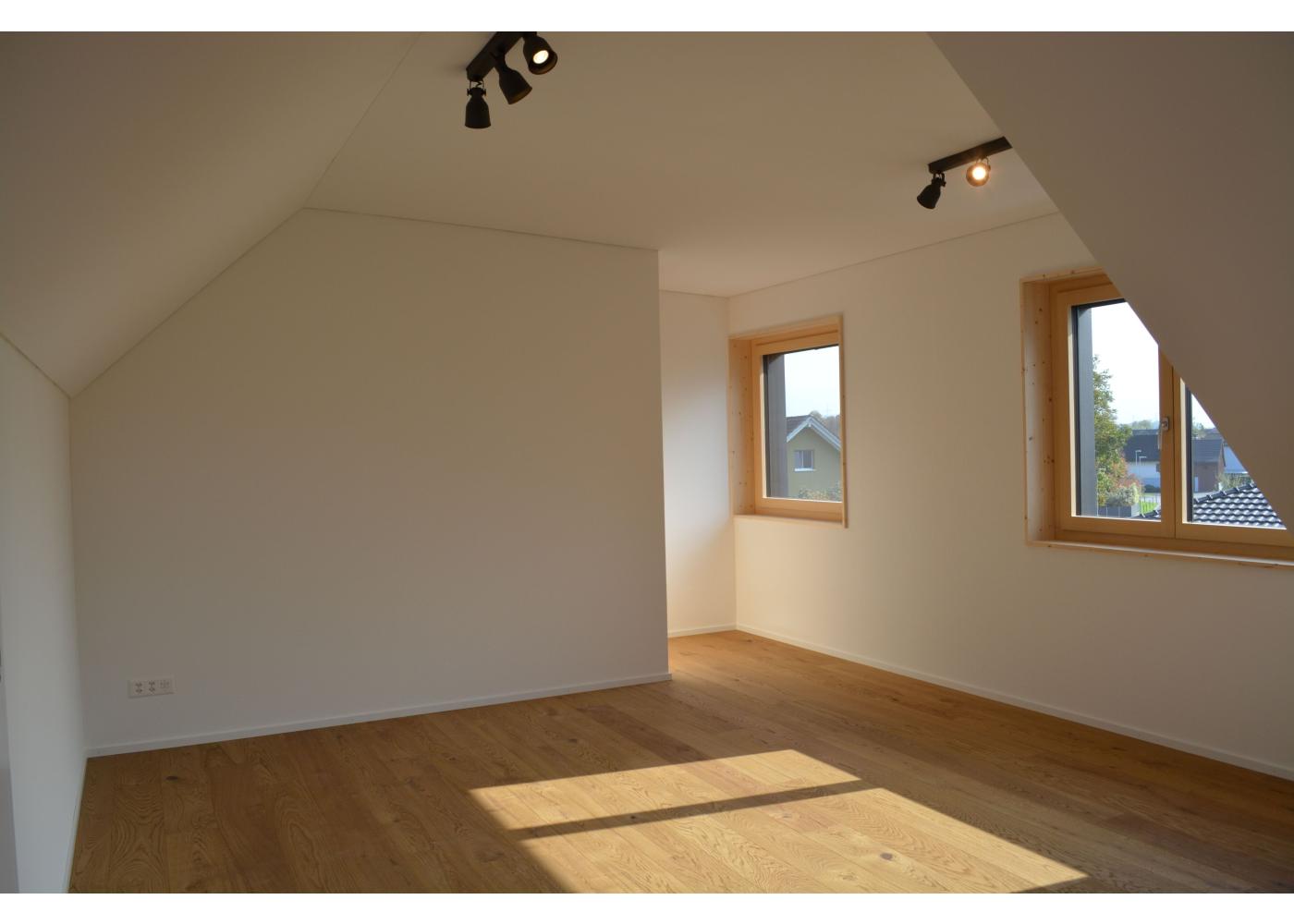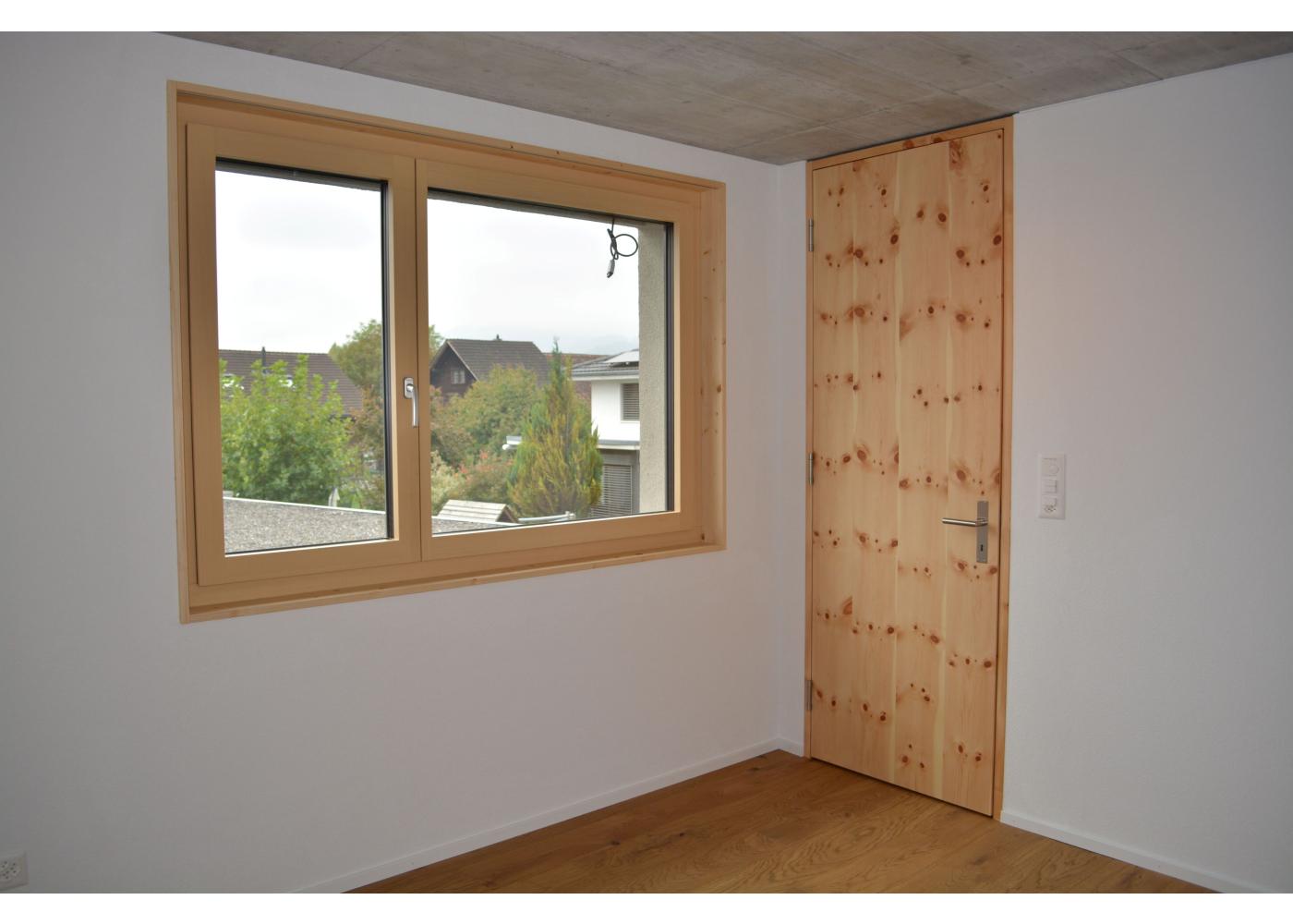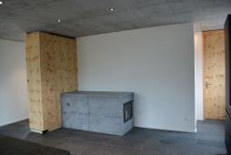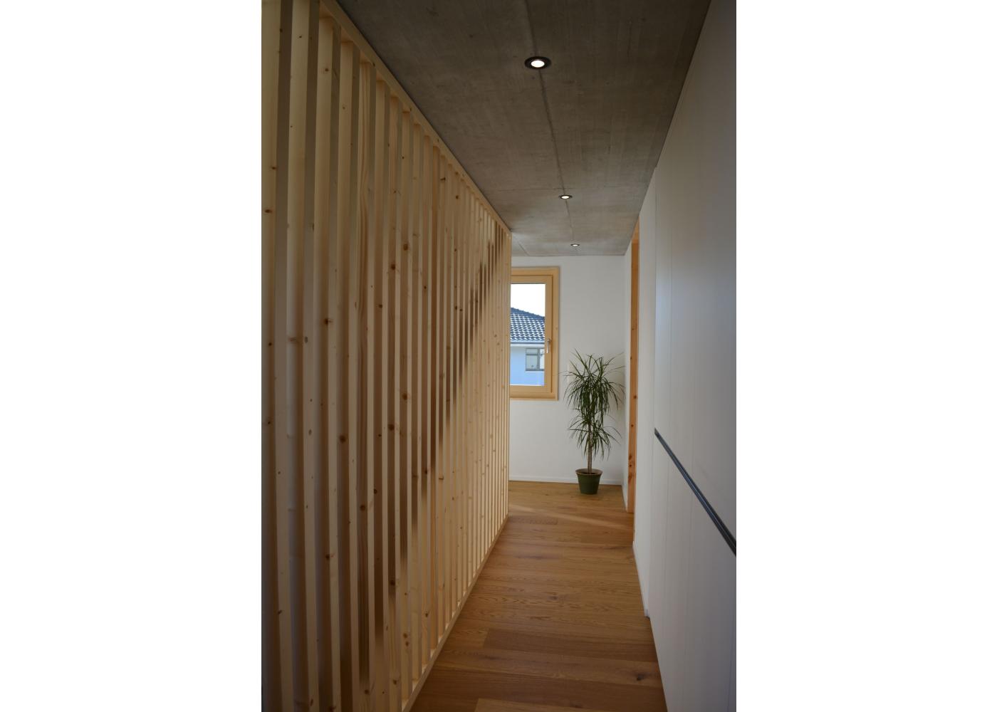Formal und volumetrisch wurde dieses Einfamilienhaus auf das denkmalgeschützte Gebäude ausgerichtet. Gegen Westen, mit dem grossen Rasen und Spielbereich, wurde mit einer Holzfassade und Holzterrasse der Charme unterstrichen. Gedämmt mit Mineralwolle und einem Dickschichtputz und 4mm Körnung, sowie einem Doppelfalzdach ist eine hohe Langlebigkeit garantiert. Sichtbetondecken im Kontrast zu Arvenmöbel und raumhohen Arven-Blockrahmentüren strahlen ein grossartiges Ambiente aus.